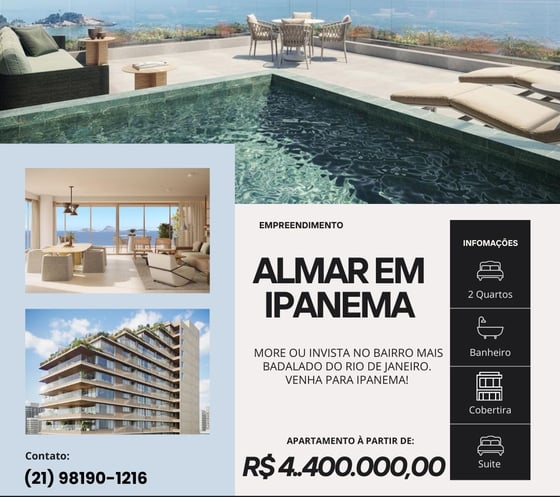 Prepare-se para o lançamento exclusivo do Almar Ipanema! Desfrute de apartamentos de alto padrão com 3 e 4 suítes, em uma localização privilegiada no coração de Ipanema. Arquitetura sofisticada, tecnologia de ponta e uma experiência de vida única, conectando você ao melhor do estilo carioca.